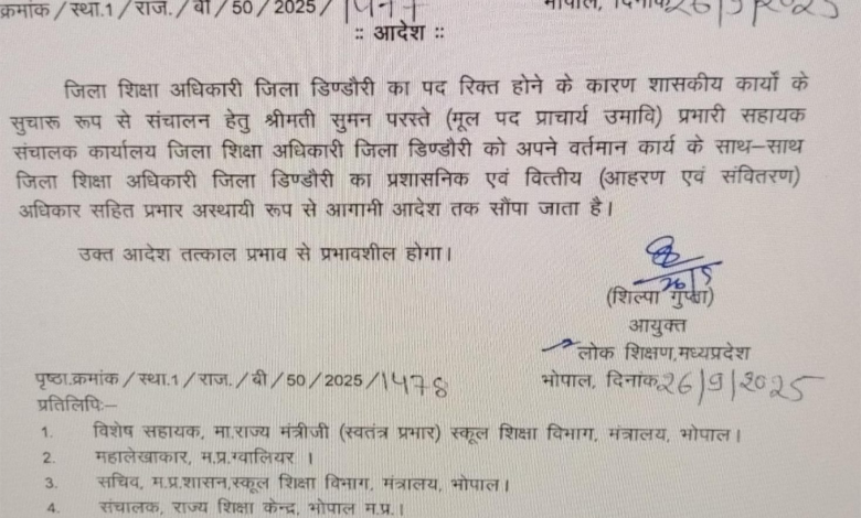 लोक शिक्षण संचालनालय की आयुक्त श्रीमती शिल्पा गुप्ता द्वारा हस्ताक्षरित यह आदेश तत्काल प्रभाव से लागू कर दिया गया है। आदेश की प्रतिलिपि राज्य शासन के मंत्री, प्रमुख सचिव, महालेखाकार, राज्य शिक्षा केन्द्र भोपाल, कलेक्टर डिण्डौरी, जिला पंचायत सीईओ, संयुक्त संचालक जबलपुर संभाग सहित अन्य संबंधित अधिकारियों एवं कार्यालयों को भी प्रेषित की गई है।