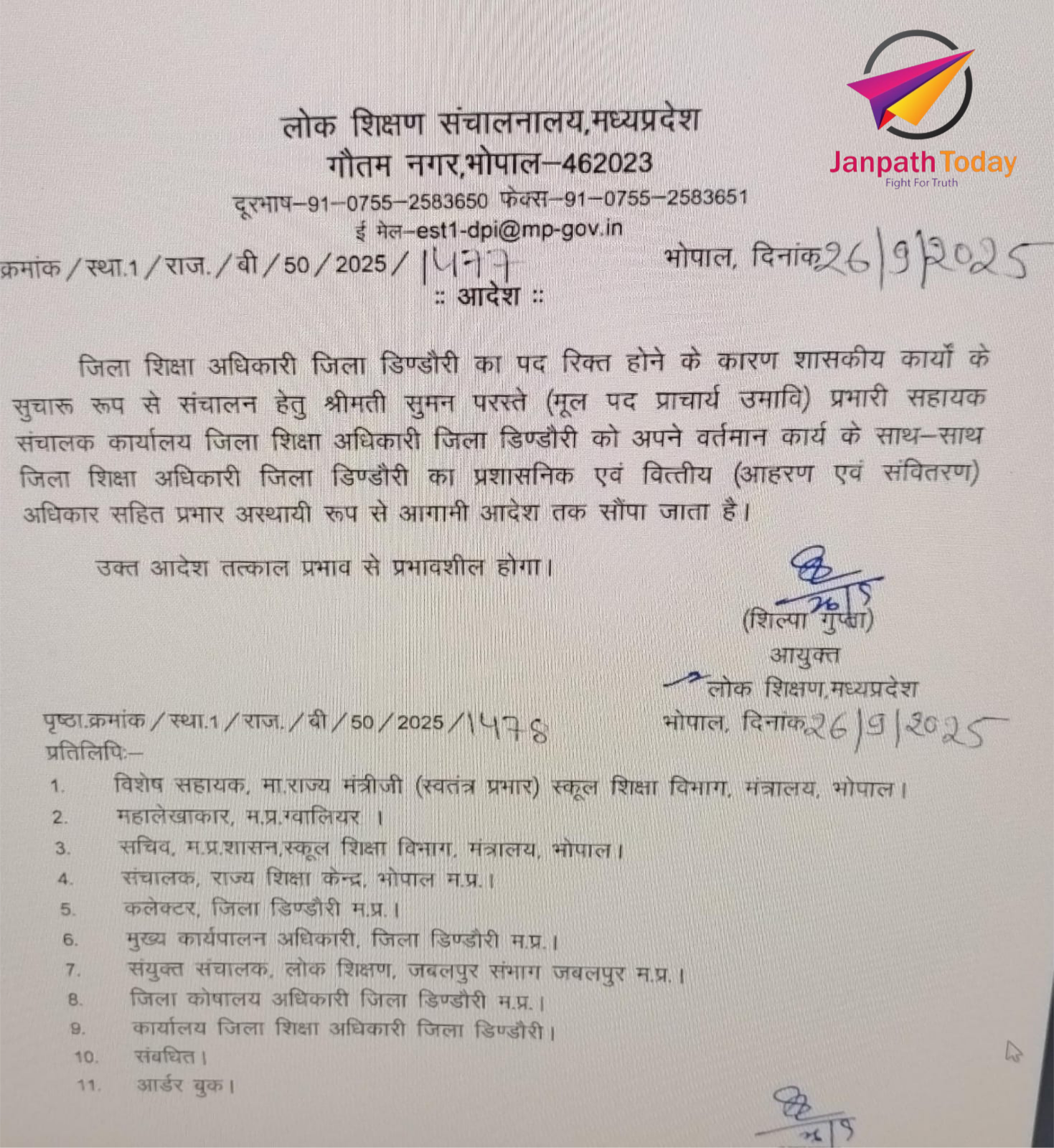 लोक शिक्षण संचालनालय की आयुक्त श्रीमती शिल्पा गुप्ता द्वारा हस्ताक्षरित यह आदेश तत्काल प्रभाव से लागू कर दिया गया है। आदेश की प्रतिलिपि राज्य शासन के मंत्री, प्रमुख सचिव, महालेखाकार, राज्य शिक्षा केन्द्र भोपाल, कलेक्टर डिण्डौरी, जिला पंचायत सीईओ, संयुक्त संचालक जबलपुर संभाग सहित अन्य संबंधित अधिकारियों एवं कार्यालयों को भी प्रेषित की गई है।