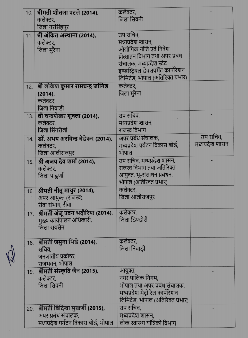 नए आदेश के अनुसार 2014 बैच की IAS श्रीमति अंजू पवन भदौरिया को CEO जिला पंचायत रायसेन से स्थानांतरित कर कलेक्टर डिंडौरी के पद पर नवीन पदस्थापना की गई है ।