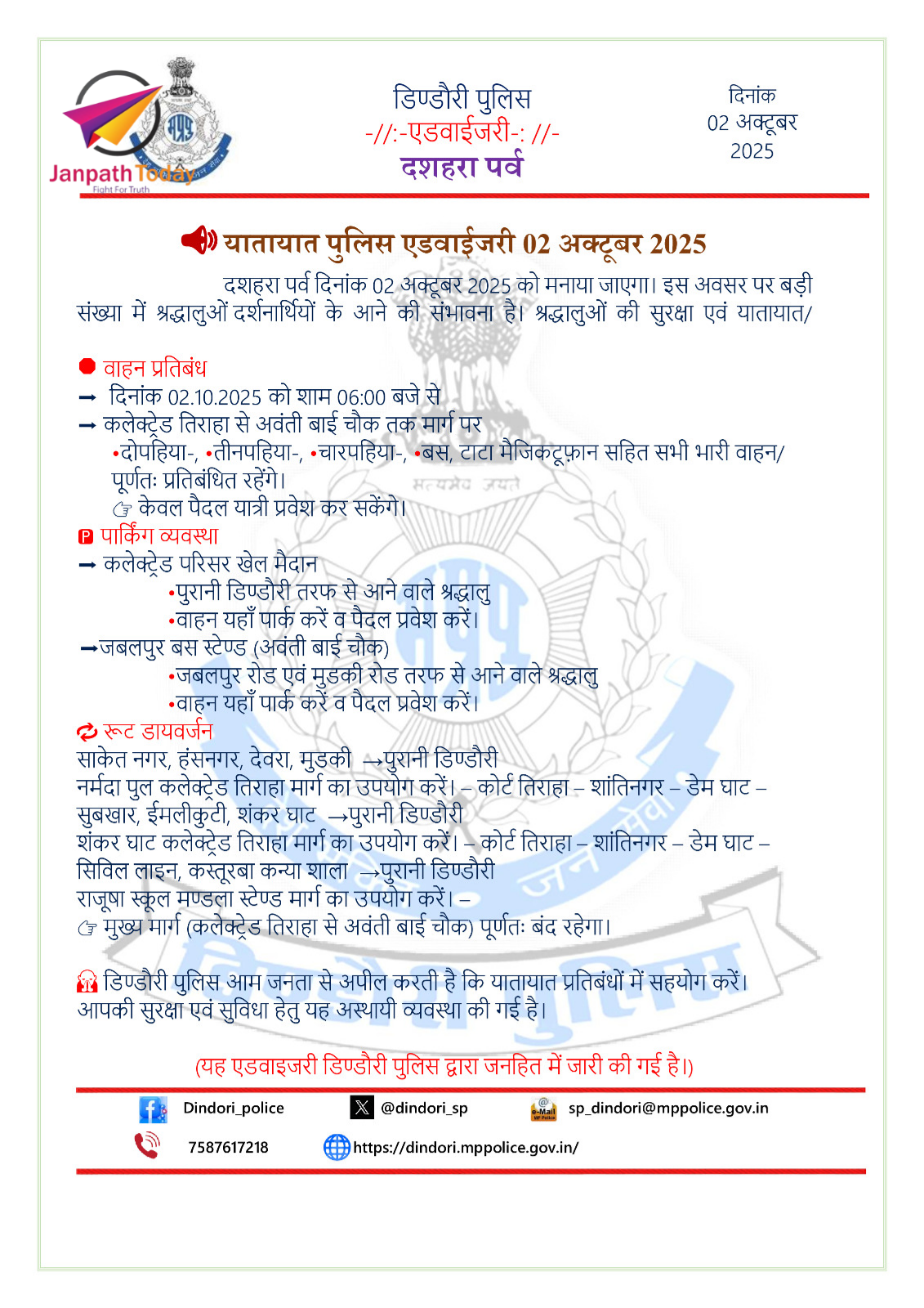 जनपथ टुडे डिंडोरी 01 अक्टूबर – पुलिस अधीक्षक के मार्गदर्शन में जिले के सभी विकासखंड, तहसील और जिला मुख्यालय पर दशहरा पर्व को ध्यान में रखते हुए वाहनों के आवागमन तथा आम नागरिकों की सुरक्षा व्यवस्था को चुस्त दुरुस्त बनाने के लिए विशेष निर्देश जारी किए गए हैं। यातायात प्रभारी सुभाष उइके ने बताया कि दशहरा पर्व पर सुरक्षा एवं यातायात व्यवस्था बनाए रखने के लिए डिंडौरी पुलिस ने 2 अक्टूबर 2025 को लागू होने वाली विस्तृत यातायात एडवाइजरी जारी की है। पुलिस ने बताया कि इस दिन बड़ी संख्या में श्रद्धालुओं के आगमन की संभावना को देखते हुए विशेष यातायात व्यवस्था लागू की जाएगी।