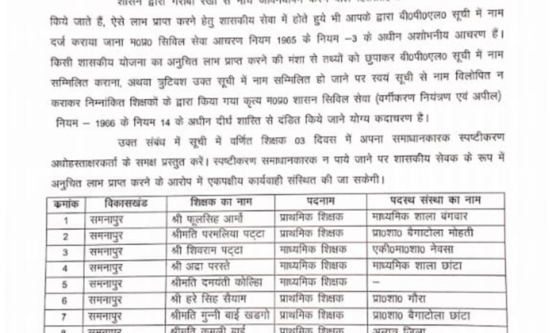उक्त संबंध में सूची में वर्णित शिक्षक 03 दिवस में अपना समाधानकारक स्पष्टीकरण अधोहस्ताक्षरकर्ता के समक्ष प्रस्तुत करें। स्पष्टीकरण समाधानकारक न पाये जाने पर शासकीय सेवक के रूप में अनुचित लाभ प्राप्त करने के आरोप में एकपक्षीय कार्यवाही संस्थित की जा सकेगी।