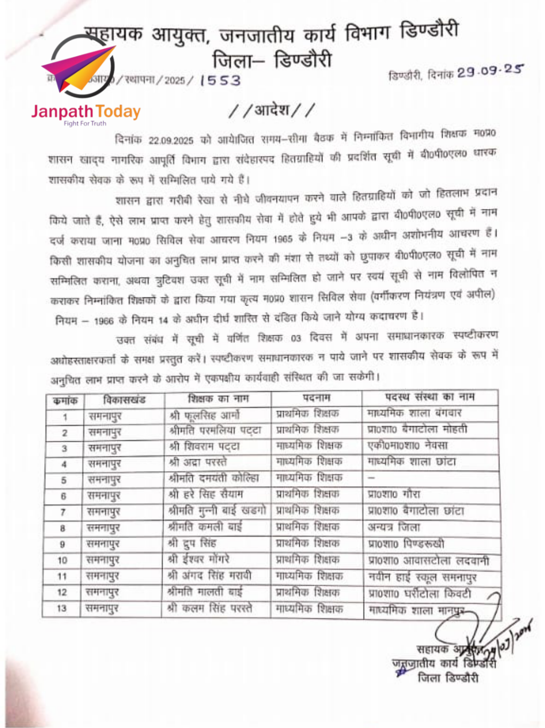 दिनांक 22.09.2025 को आयोजित समय-सीमा बैठक में निम्नांकित विभागीय शिक्षक म०प्र० शासन खाद्य नागरिक आपूर्ति विभाग द्वारा संदेहास्पद हितग्राहियों की प्रदर्शित सूची में बी०पी०एल० धारक शासकीय सेवक के रूप में सम्मिलित पाये गये हैं।
