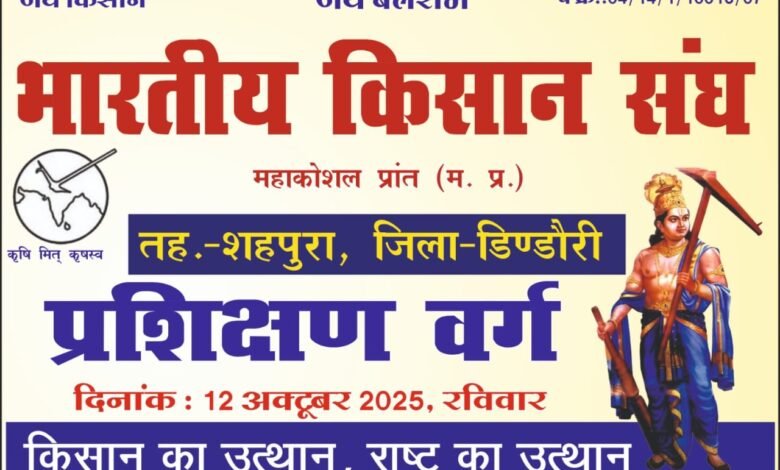 जनपथ टुडे डिंडोरी 11 अक्टूबर 2025 शहपुरा: भारतीय किसान संघ का एकदिवसीय प्रशिक्षण वर्ग रविवार को शहपुरा स्थित गुप्ता मैरिज गार्डन में होगा आयोजित जिसमें महाकौशल प्रांत के संगठनमंत्री तुलाराम ,महामंत्री प्रहलाद पटेल एवं अन्य पदाधिकारी कार्यक्रम में उपस्थित होकर किसानों का मार्गदर्शन करेंगे ।