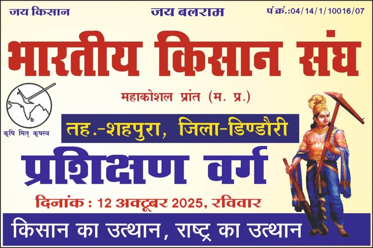 किसान संघ के जिलाध्यक्ष बिहारी लाल साहू ने बताया कि दिनांक 12.10.2025 रविवार को प्रशिक्षण वर्ग चार चरणों में आयोजित होगा जिसके अंतर्गत किसानों को भारतीय किसान संघ के रीति नीति,कार्य के आयाम और किसानो के अधिकारों और समस्याओं को लेकर विस्तार से चर्चा किया जाएगा।