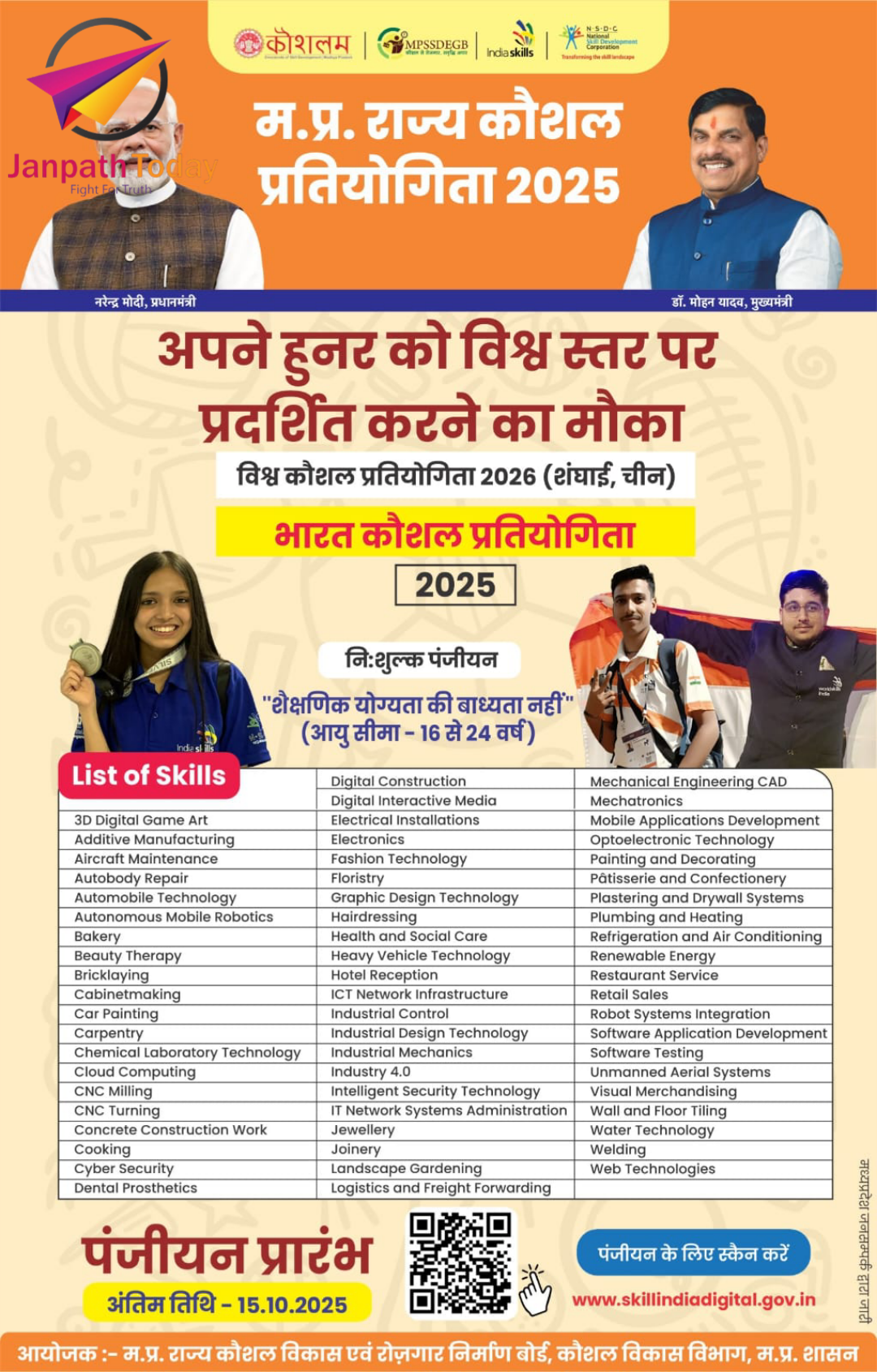 जनपथ टुडे डिंडोरी 11 अक्टूबर- मध्यप्रदेश के युवाओं के लिए एक सुनहरा अवसर लेकर आई है म.प्र. राज्य कौशल प्रतियोगिता 2025, जिसके ज़रिए प्रतिभाशाली युवा अब अपने हुनर को विश्व कौशल प्रतियोगिता 2026 (शंघाई, चीन) में प्रदर्शित करने का मौका पा सकेंगे।