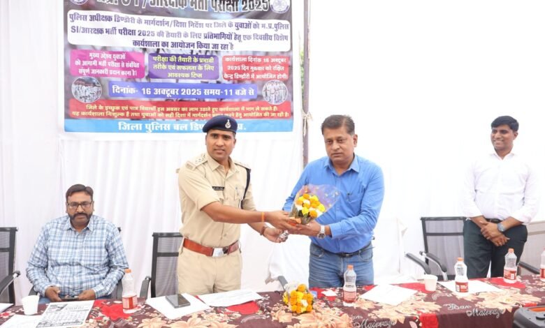 जनपथ टुडे डिंडौरी 16 अक्टूबर 2025— पुलिस अधीक्षक डिंडौरी श्रीमती वाहनी सिंह के मार्गदर्शन एवं निर्देशन में जिले के इच्छुक युवाओं के लिए म.प्र. पुलिस सब-इंस्पेक्टर (SI) एवं आरक्षक भर्ती परीक्षा 2025 की तैयारी हेतु एक दिवसीय विशेष कार्यशाला का सफल आयोजन किया गया। यह कार्यशाला रक्षित केन्द्र डिंडौरी में आयोजित की गई, जिसमें जिले के सैकड़ों युवक-युवतियों ने उत्साहपूर्वक भाग लिया।
