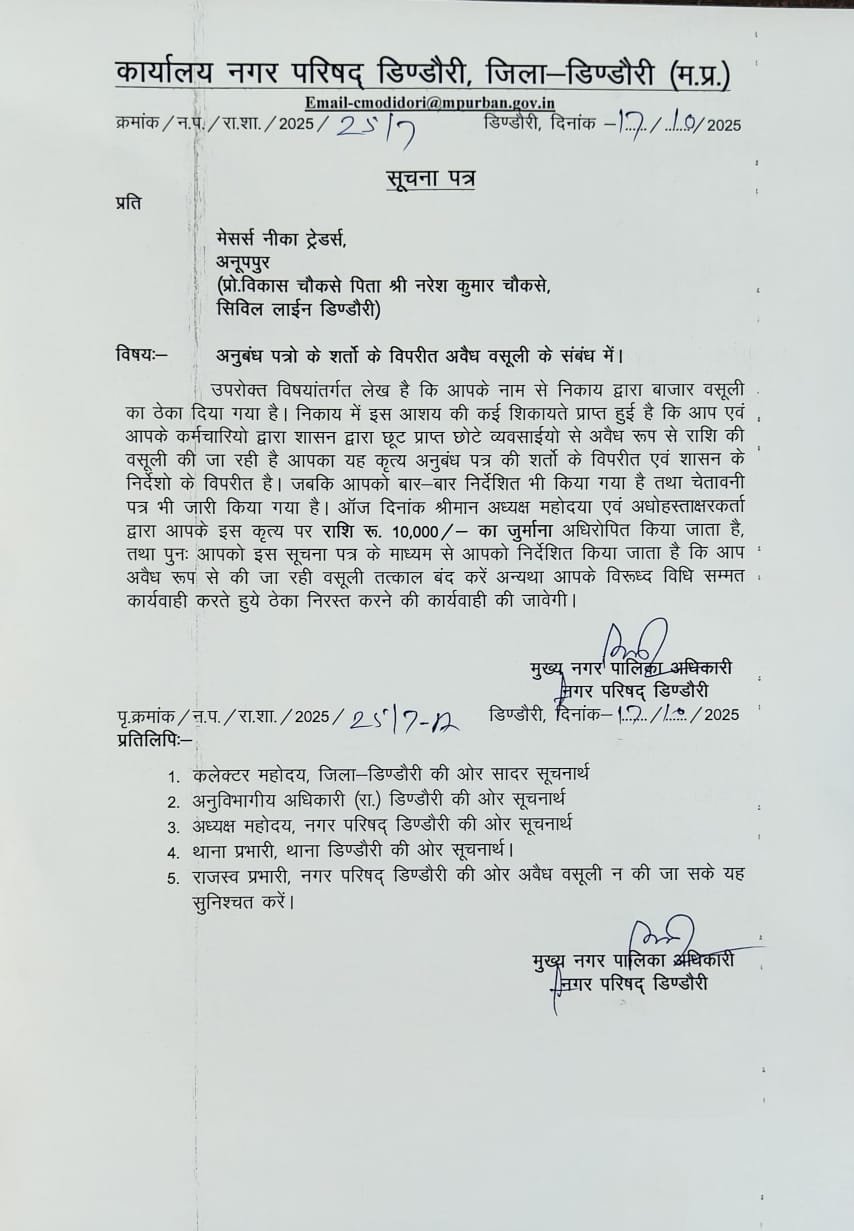 जनपथ टुडे डिंडोरी 18 अक्टूबर— नगर परिषद डिंडोरी ने बाजार वसूली में मनमानी करने वाले ठेकेदार मेसर्स नीका ट्रेडर्स पर कार्रवाई की है। अनुबंध की शर्तों का उल्लंघन करते हुए अवैध वसूली की शिकायतें मिलने पर परिषद ने ठेकेदार को नोटिस जारी कर ₹10,000 का जुर्माना लगाया है।