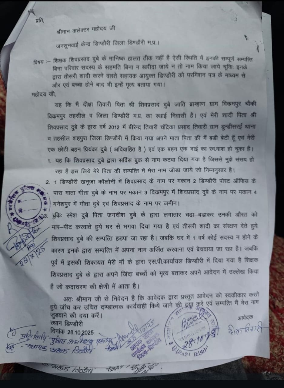 दीक्षा तिवारी का कहना है कि उनके पिता की मानसिक स्थिति कुछ समय से ठीक नहीं है, और कुछ लोग इस स्थिति का फायदा उठाकर उनकी संपत्ति हड़पने की कोशिश कर रहे हैं। उन्होंने बताया कि पिता ने तीसरी शादी के लिए सहायक आयुक्त डिण्डौरी को अनुमति पत्र भेजा है, जबकि वे पहले से विवाहित हैं और उनकी दो पुत्रियाँ जीवित हैं।आवेदिका ने गंभीर आरोप लगाते हुए कहा कि पिता द्वारा कुछ दस्तावेजों में जीवित बच्चों को “मृत” घोषित किया गया है, जो एक गंभीर अनियमितता है। साथ ही, संपत्ति के नामांतरण और विक्रय में बाहरी लोगों की संलिप्तता भी दिखाई दे रही है।