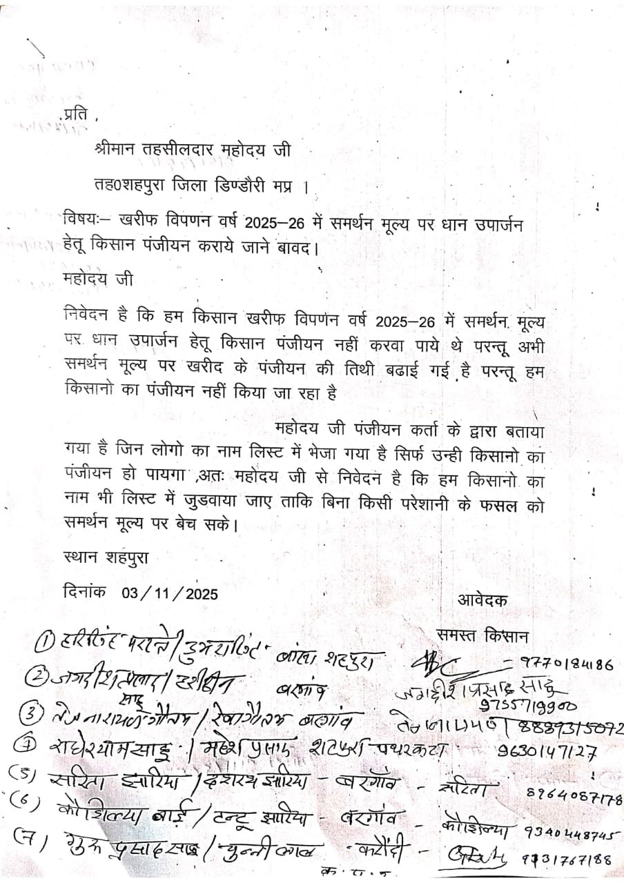 जनपथ टुडे डिण्डौरी शहपुरा 03 नवम्बर2025 – विकासखण्ड शहपुरा अंतर्गत कई ग्राम पंचायत में किसानों के खेतों में धान है लेकिन उनका गिरदावरी ना होने के कारण किसानों का धान पंजीयन नहीं हो पा रहा है भूमिहार रिक्त दिख रही हैं जिससे किसान लगातार परेशान हो रहे हैं और पंजीयन डेट बढ़ाई जाने के बाद भी शहपुरा विकासखण्ड में सिर्फ 53 किसानों का ही पंजीयन किया जाऐगा ऐसा उनका विभागीय सिस्टम बोल रहा है । जिसे उतने पर ही लॉक कर दिया गया जिस कारण किसान लगातार परेशान हो रहे हैं। पंजीयन की समस्या को देखते हुए लगभग 20 गांव के किसानो ने अनुविभागीय अधिकारी एवं तहसीलदार के नाम एक आवेदन देकर उन्हें अवगत कराया की तत्काल गिरदावरी की डेट बढ़ाई जाए और पंजीयन चालू किया जाए जिससे किसान परेशान ना हो ।