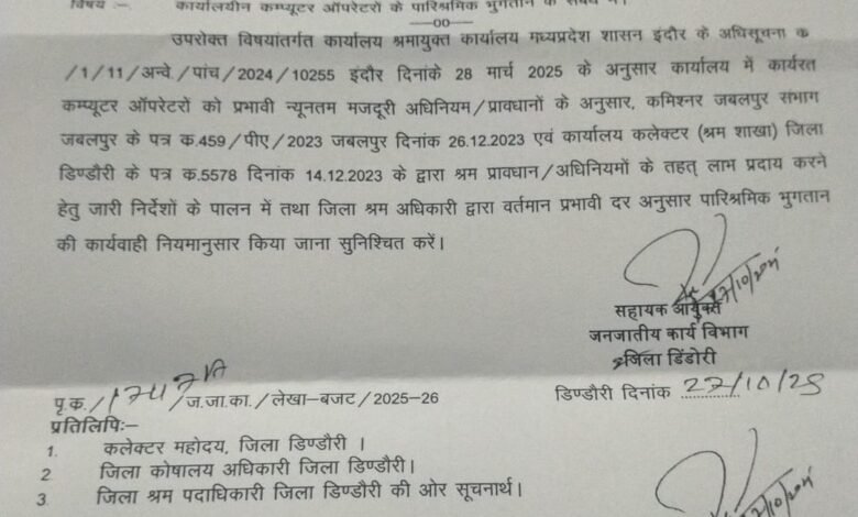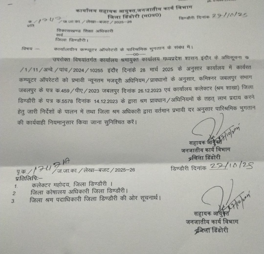 जनपथ टुडे डिंडौरी07 नवम्बर 2025- जनजातीय कार्य विभाग, जिला डिंडौरी के सहायक आयुक्त द्वारा विगत अक्टूबर माह में जिले के सभी विकासखंड शिक्षा अधिकारियों (BEO) को आदेश जारी करते हुए निर्देश दिया गया है कि जनजातीय कार्य विभाग, बीईओ कार्यालयों एवं संकुल प्राचार्य शासकीय कार्यालयों में कार्यरत कुशल कंप्यूटर ऑपरेटरों को प्रभावी न्यूनतम मजदूरी अधिनियम प्रावधानों के अनुसार लाभ प्रदान करने की कार्यवाही नियमानुसार सुनिश्चित करें। बता दें कि यह निर्णय लंबे समय से अल्प मानदेय पर कार्य कर रहे ऑपरेटरों के लिए राहत लेकर आया है।