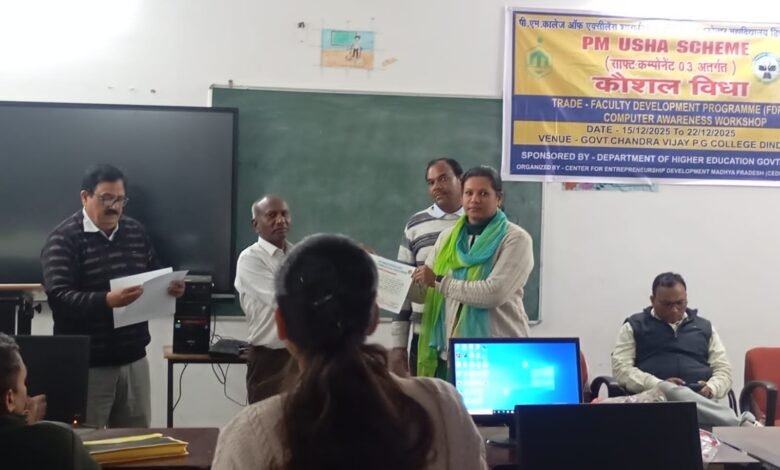 जनपथ टुडे डिण्डौरी 22 दिसंबर 2025 – पीएम उषा के सॉफ्ट कंपोनेंट के अंतर्गत शासकीय प्रधानमंत्री कॉलेज ऑफ एक्सीलेंस चंद्र विजय कॉलेज डिंडोरी सात दिवसीय कंप्यूटर जागरूकता का सफल समापन हुआ। इस कार्यशाला में प्रोफेसर एवं कार्यालय स्टाफ को कंप्यूटर जागरूकता की जानकारी नवीनतम तकनीकों व इसके उपयोग से अवगत कराया गया। समापन अवसर पर कार्यक्रम के अध्यक्ष प्रभारी प्राचार्य डॉ. उद्दे ने , कहा कि नई शिक्षा नीति में य तकनीक आधारित शिक्षण की भूमिका अत्यंत महत्वपूर्ण है। इसी की दिशा में ऐसी कार्यशालाएं प्रोफ़ेसोरो को भविष्य के लिए तैयार करती है। कार्यक्रम के नोडल अधिकारी ने डॉ. अमित बेलिया ने प्रोफेसरों को इससक्रिय भागीदारी की सराहना की। मुख्य प्रशिक्षक श्रेयांश पाठक एवं निशांत पाटकर ने सभी की कार्य भागीदारी की सरहना की।