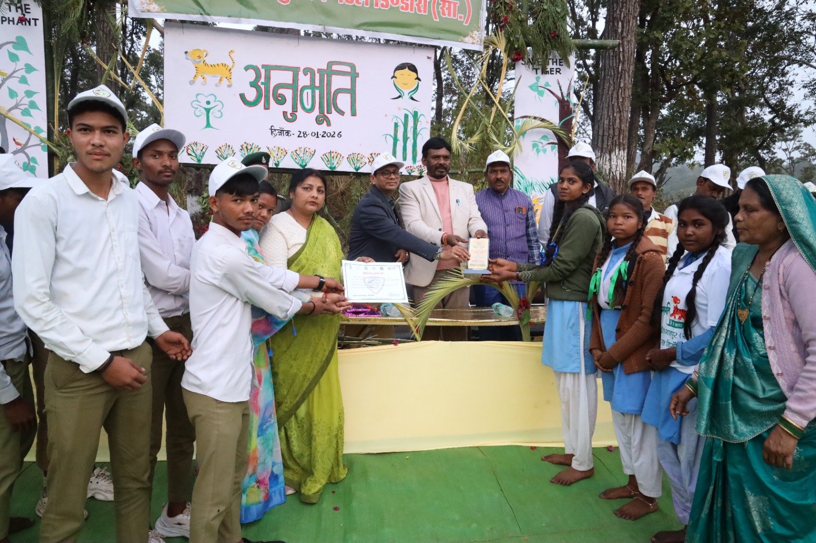 अनुभूति मास्टर ट्रेनर शोभित राम बनवासी एवं अमृत सिंह मसराम अनुभूति प्रेरक के द्वारा शिविर स्थल पर विद्यार्थियों को अनुभूति कार्यक्रम की रूपरेखा एवं उद्देश्यों का परिचय (संक्षिप्त ब्रीफिंग),अनुभूति किट का वितरण,अनुभूति की थीम “मैं भी बाघ”, *”हम हैं बदलाव”,” हम हैं धरती के दूत”** की जानकारी दी गई।इसके बाद विद्यार्थियों को अनुभूति की आचार संहिता बताकर तीन ग्रुपों में बांटकर प्रकृति पथ पर घास,सुखे पत्ते, पेड़-पौधे, वृक्ष,झाड़ी, लघु वनौषधियों की जानकारी,उनकी पहचान,उपयोगिता, महत्व तथा उनका संरक्षण एवं संवर्धन,जैव विविधता, पारिस्थितिकी तंत्र, मृदा, जड़-तंत्र और वृक्ष के घटक, वानिकी गतिविधियों की जानकारी, दीमक की बामी, मधुमक्खी के छत्ते,बया पक्षी का घोंसला, शाकाहारी, मांसाहारी वन्य जीव, मृग- हिरण में अंतर, कीट- पतंगे, सरीसृप जीव,गिद्ध, पक्षियों का महत्व इत्यादि की जानकारी दी । प्रकृति पथ से वापस होकर अनुभूति लोगों पर सामूहिक फोटोग्राफी,दोपहर भोजन उपरांत साहसिक गतिविधियां, खेल-खेल में संरक्षण शिक्षण अंतर्गत *कबड्डी, रस्साखींच* प्रतियोगिता खेलों के माध्यम से प्रकृति संरक्षण को रोचक ढंग से समझाया गया। मिशन लाइफ, संवहनीय जीवन संबंधी, संयुक्त वन प्रबंधन,वन विभाग की पद अनुक्रमणिका,वन धन के उत्पाद,क्विज प्रश्नोत्तरी,चित्रकला के पश्चात पुरस्कार वितरण,अनसिले कपड़े से थैला निर्माण,शपथ ग्रहण, सामूहिक अनुभूति गीत “हम हैं धरती के दूत”के साथ कार्यक्रम का समापन हुआ पूरे कार्यक्रम के दौरान इको फ्रेंडली सामग्री का उपयोग किया गया।