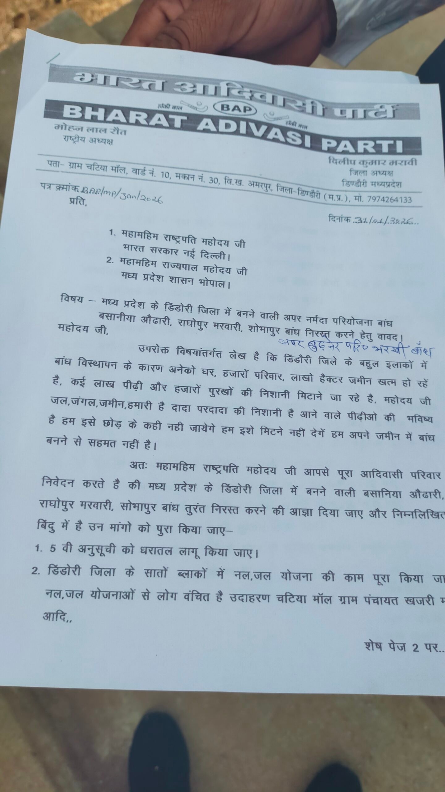 महामहिम राष्ट्रपति और राज्यपाल के नाम दिए गए ज्ञापन लेख है कि डिंडौरी जिले के बहुल इलाकों में बांध विस्थापन के कारण अनेको घर, हजारों परिवार, लाखो हैक्टर जमीन खत्म हो रही हैं कई लाख पीढ़ी और हजारों पुरखों की निशानी मिटने जा रही है। ज्ञापन में कहा गया कि जल, जंगल, जमीन, हमारी है दादा परदादा की निशानी है आने वाले पीढ़ीओ की भविष्य है हम इसे छोड़ के कही नही जायेगे हम इसे मिटने नहीं देगें हम अपने जमीन में बांध बनने से सहमत नहीं है। ज्ञापन के माध्यम से मांग करते हुए कहा के मध्य प्रदेश के डिंडोरी जिला में बनने वाले बसानिया औढारी, राघोपुर मरवारी, सोभापुर बांध तुरंत निरस्त करने के निर्देश जारी किए जाए ।