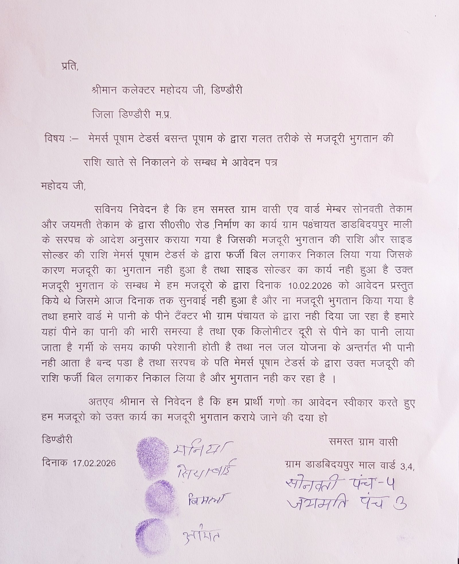 जनपद टुडे डिंडोरी 17 फरवरी— जनपद पंचायत डिंडौरी के अंतर्गत ग्राम पंचायत डांड विदयपुर माल में भ्रष्टाचार का एक गंभीर मामला प्रकाश में आया है। यहाँ सीसी रोड निर्माण में पसीना बहाने वाले गरीब मजदूरों की मजदूरी की राशि मेसर्स पूषम ट्रेडर्स द्वारा कूटरचित तरीके से और फर्जी बिल लगाकर निकाल ली गई है। मंगलवार को आयोजित जनसुनवाई में पहुँचीं महिला पंचों ने कलेक्ट्रेड में इस फर्जीवाड़े की लिखित शिकायत कर दोषियों पर कठोर कार्रवाई की मांग की है।