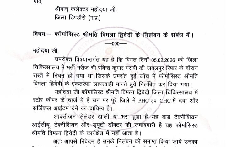 ज्ञात हो कि विगत दिनों 05 फरवरी 2026 को जिला चिकित्सालय में भर्ती मरीज रविन्द्र कुमार मरावी की जबलपुर रिफर के दौरान रास्ते में निधन हो गया था जिसके उपरांत हुई जॉच में फॉर्मासिस्ट श्रीमति विमला द्विवेदी की कार्य में लापरवाही मानते हुये निलंबित कर दिया गया था ।