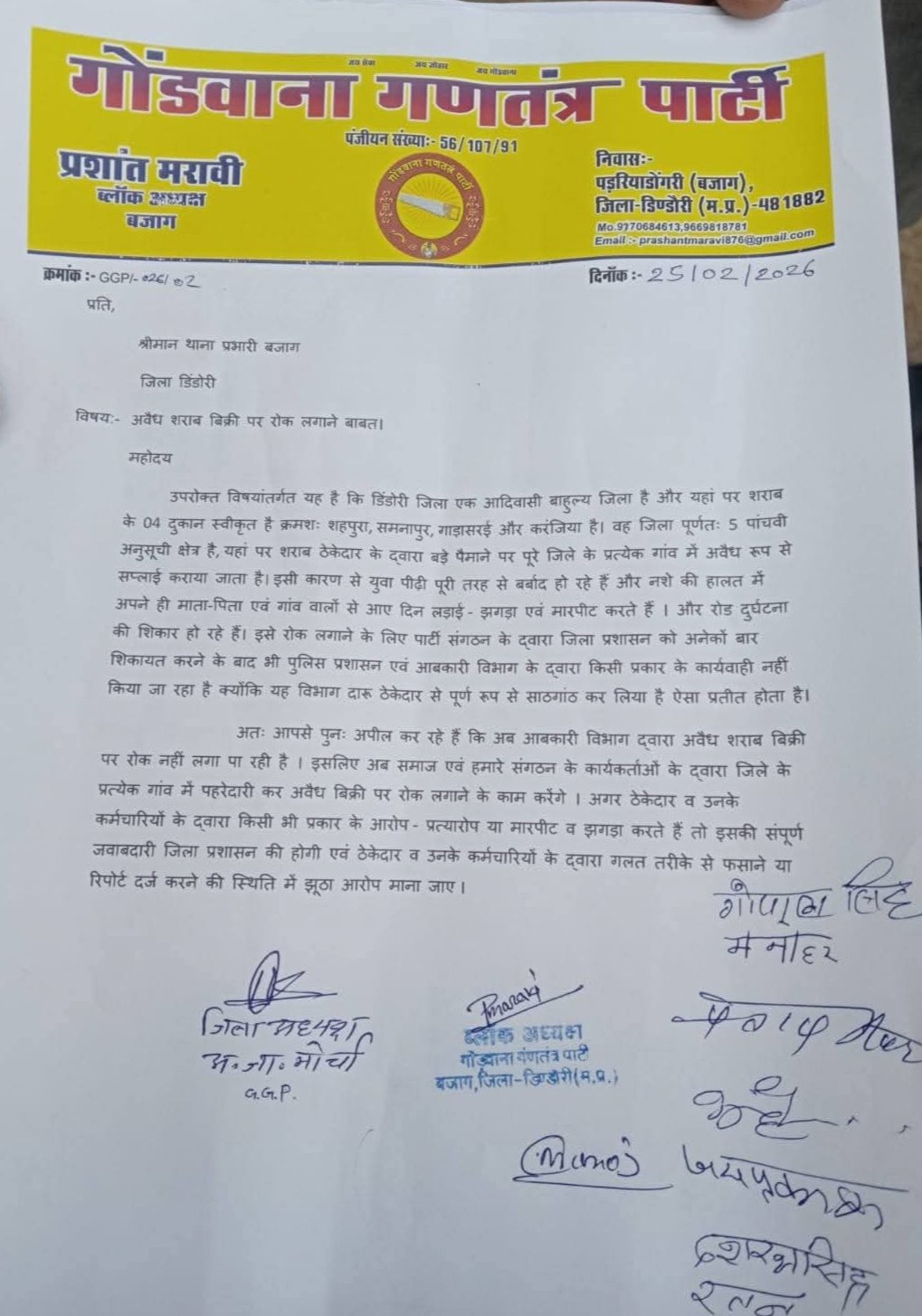 *जनपथ टुडे डिंडोरी 26 फरवरी 2026* आदिवासी बाहुल्य क्षेत्र डिंडौरी जिले में अवैध शराब बिक्री को लेकर गोंडवाना गणतंत्र पार्टी ने मोर्चा खोल दिया है। पार्टी पदाधिकारियों एवं कार्यकर्ताओं ने बजाग थाना पहुंचकर थाना प्रभारी को विस्तृत ज्ञापन सौंपते हुए अवैध शराब की सप्लाई पर तत्काल प्रभाव से रोक लगाने की मांग की।