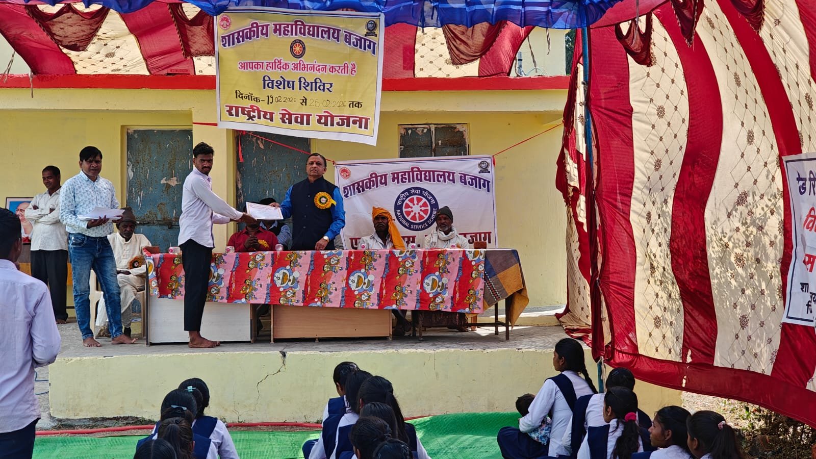 जनपथ टुडे डिंडोरी 26 फरवरी 2026 – शासकीय महाविद्यालय बजाग की एन एस एस इकाई का सात दिवसीय विशेष शिविर ग्राम मिढली में दिनांक 19 से 25 फरवरी 2026 तक आयोजित किया गया था जिसका भव्य समापन समारोह कार्यक्रम 25 फरवरी को ग्राम मिढ़ली के ग्राम पंचायत भवन में संपन्न हुआ। इस कार्यक्रम ने ग्राम विकास और विद्यार्थी नेतृत्व की एक नई मिसाल पेश की। शिविर समापन समारोह कार्यक्रम का शुभारंभ मुख्य अतिथियों द्वारा दीप प्रज्वलन के साथ किया गया। मुख्य अतिथि के रूप में शामिल होकर महाविद्यालय प्राचार्य डॉ मनोज कुमार कुशवाह द्वारा उपस्थित समस्त विद्यार्थी स्वयंसेवक एवं स्वयंसेविकाओं को सम्बोधित कर बौद्धिक मार्गदर्शन करते हुए वक्तव्य में कहा ; ” राष्ट्रीय सेवा योजना का मुख्य उद्देश्य छात्रों में सेवा भावना, अनुशासन एवं नेतृत्व क्षमता का विकास करना है। इस प्रकार के शिविर से स्वयंसेवियों में अनुशासन, कर्तव्यनिष्ठा, आपसी भाईचारा और समाज सेवा की भावना विकसित करने में महत्वपूर्ण भूमिका निभाते है, इस शिविर के माध्यम से निश्चित ही विद्यार्थियों का समाज से जुड़ाव होकर उनके व्यक्तित्व विकास होने की सम्भावना हैं l हम सभी को स्वामी विवेकानंद के प्रेरणा का अनुसरण करना चाहिए l इस प्रकार के शिविर बच्चों में अनुशासन, कर्तव्यनिष्ठा, आपसी भाईचारा और समाज सेवा की भावना विकसित करने में महत्वपूर्ण भूमिका निभाते हैं l अपने वक्तव्य का समापन उन्होंने राष्ट्र सेवा और सामाजिक उत्तरदायित्व के संकल्प के साथ किया गया।