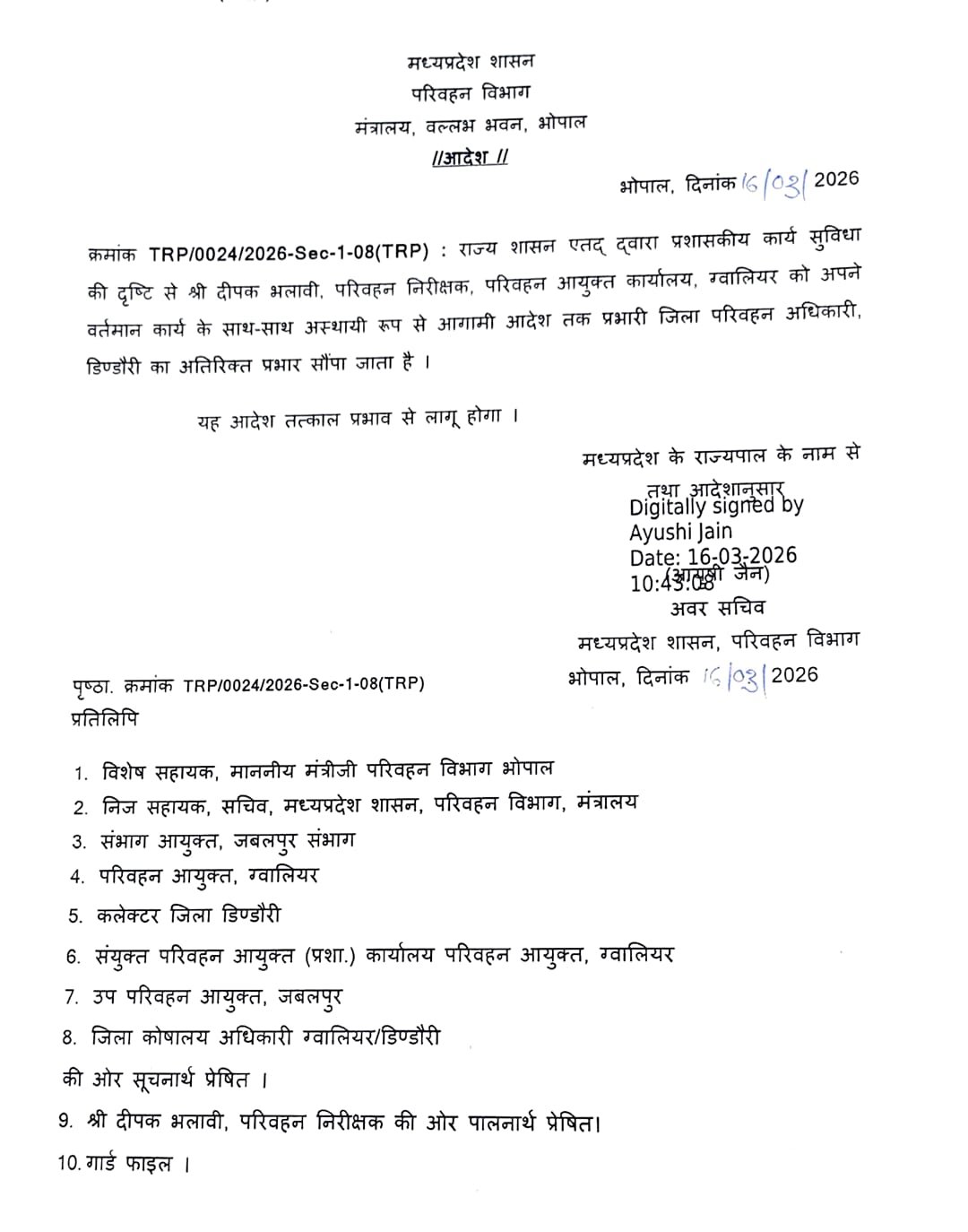 इसके पश्चात राज्य शासन द्वारा जारी आदेश दिनांक 16 मार्च 2026 के अनुसार परिवहन आयुक्त कार्यालय ग्वालियर में पदस्थ परिवहन निरीक्षक दीपक भलावी को अपने वर्तमान कार्य के साथ-साथ आगामी आदेश तक प्रभारी जिला परिवहन अधिकारी डिण्डौरी का अतिरिक्त प्रभार सौंपा गया है। शासन द्वारा जारी दोनों आदेश तत्काल प्रभाव से लागू किए गए हैं।