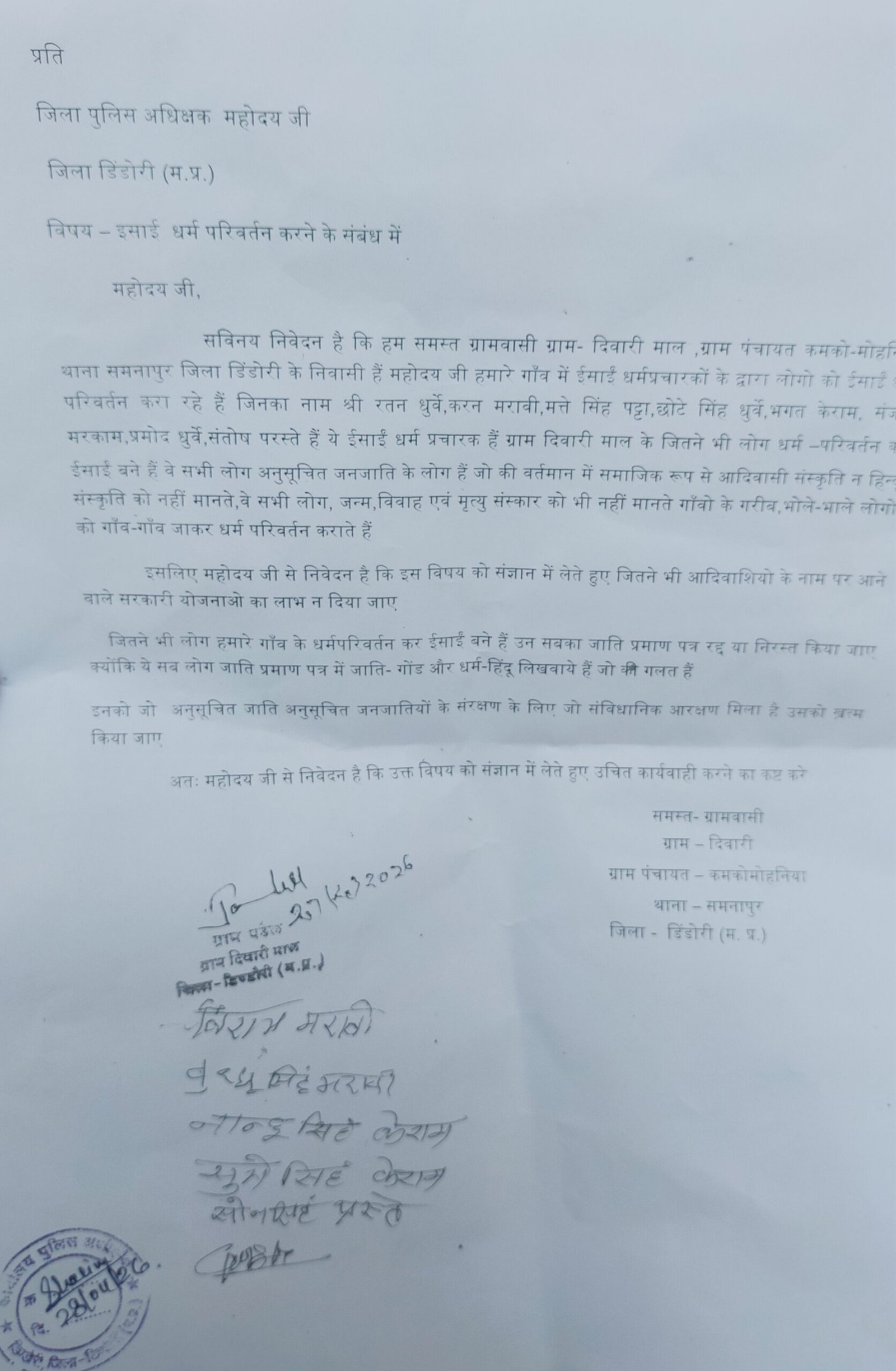 ईसाई मिशनरिया कर रही है भोले भाले आदिवासियों का धर्मांतरण – कमको मोहनिया पंचायत के दिवारी गांव से दर्जनों की संख्या में पहुंचे आदिवासियों ने की कलेक्टर,sp से लिखित शिकायत